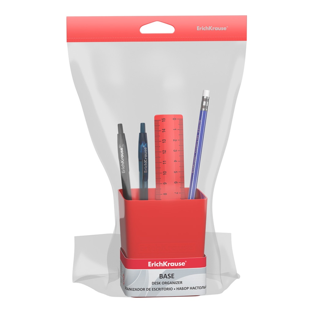 Готовый набор с наполнением. Универсальная подставка изготовлена из высококачественного пластика. В комплекте 4 предмета: 2 ручки, карандаш, линейка. Наполнение может отличаться от представленного.
