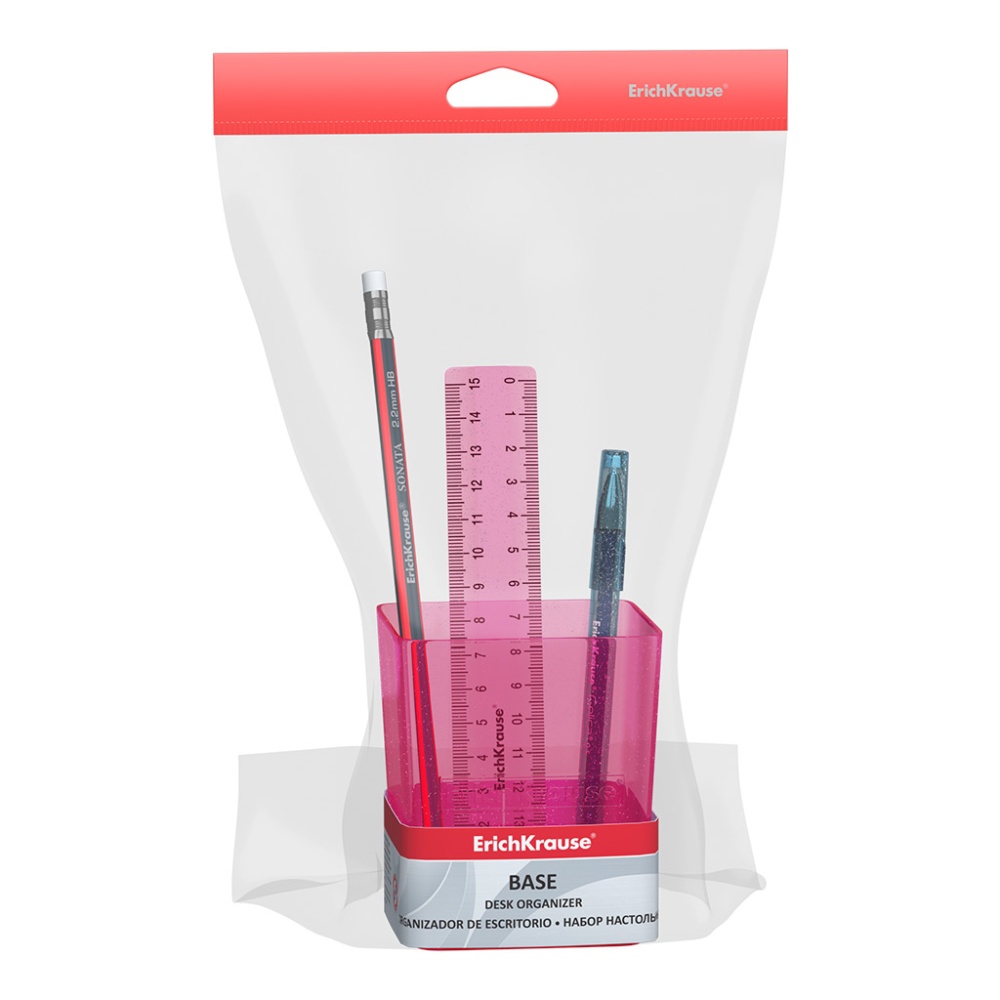 Готовый набор с наполнением. Универсальная подставка изготовлена из высококачественного пластика. В комплекте 3 предмета: ручка, карандаш, линейка. Наполнение может отличаться от представленного. Ассорти: розовый, голубой, сиреневый.