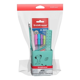 Готовый набор с наполнением. Универсальная подставка изготовлена из высококачественного пластика. В комплекте 6 предметов: 4 ручки, карандаш, линейка. Наполнение может отличаться от представленного.