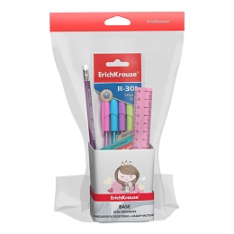 Готовый набор с наполнением. Универсальная подставка изготовлена из высококачественного пластика. В комплекте 6 предметов: 4 ручки, карандаш, линейка. Наполнение может отличаться от представленного.