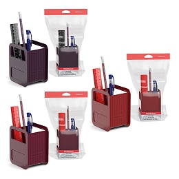 Готовый набор с наполнением. Строгая подставка изготовлена из высококачественного пластика. В комплекте 3 предмета: ручка, карандаш, линейка. Наполнение может отличаться от представленного. Ассорти: фиолетовый, красный, рубиновый.