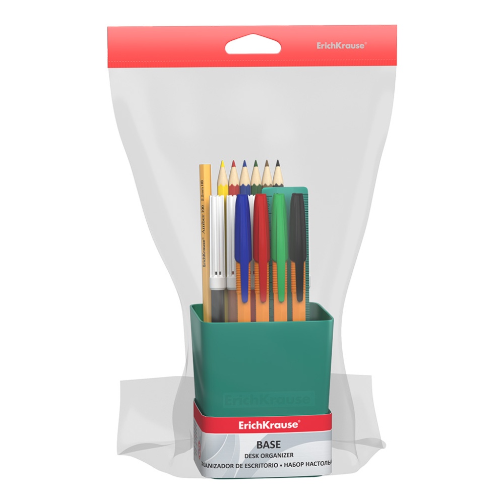 Готовый набор с наполнением для школьников. Универсальная подставка изготовлена из высококачественного пластика. В комплекте 18 предметов: 4 ручки, карандаш, 6 цветных фломастеров и карандашей, линейка. Наполнение может отличаться от представленного. Ассорти: голубой, бирюзовый, серебряный.