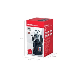 Готовый набор с наполнением. Подставка оснащена вращающимся механизмом и изготовлена из высококачественного пластика. В комплекте 12 предметов: 2 ручки, 2 карандаша, линейка, точилка, ластик, 30 скрепок, степлер 10, 1000 скоб, ножницы, нож канцелярский. Наполнение может отличаться от представленного.