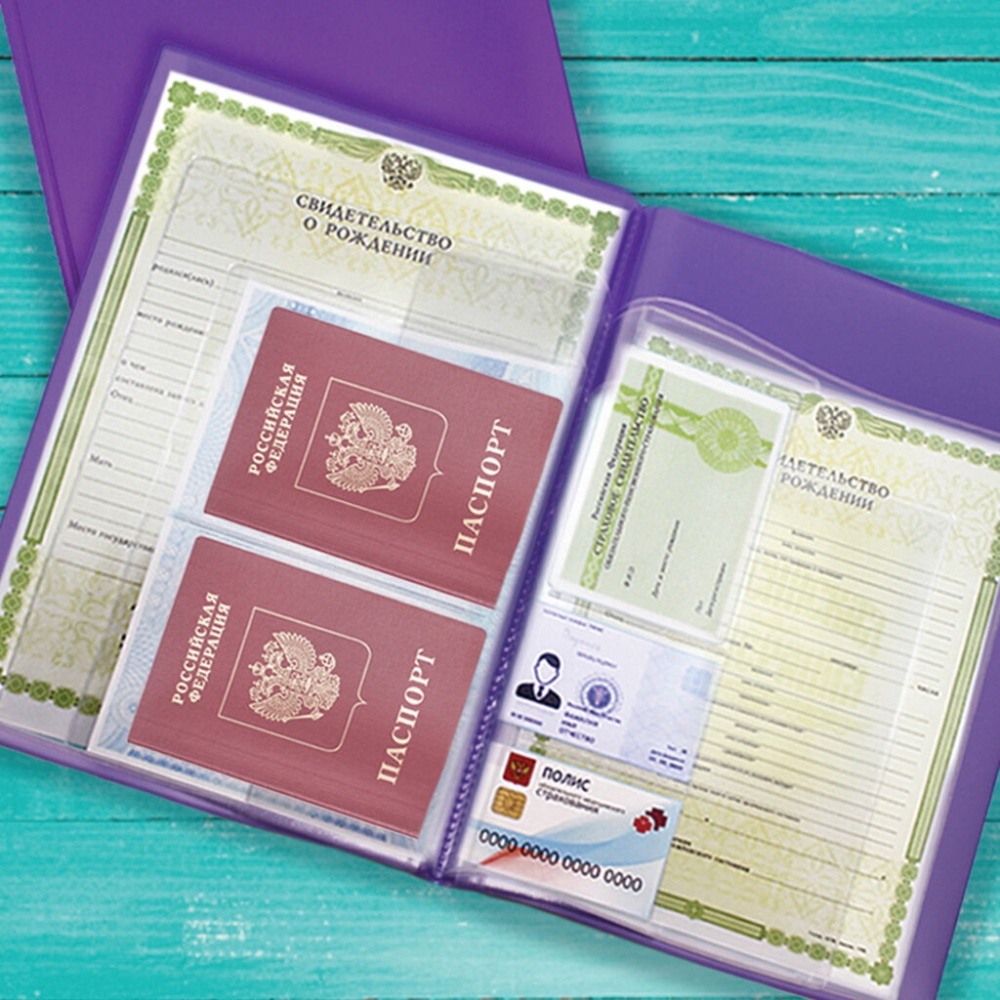 Папка для хранения всех документов. Вмещает в себя: 2 файла для формата А4 (свидетельство о рождении нового образца с 01.01.2019 г.), 2 файла для свидетельств о рождении старого образца, 2 файла для ОМС, карманы для карт ОМС, СНИЛС и дугих документов