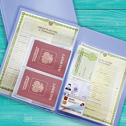 Папка для хранения всех документов. Вмещает в себя: 2 файла для формата А4 (свидетельство о рождении нового образца с 01.01.2019 г.), 2 файла для свидетельств о рождении старого образца, 2 файла для ОМС, карманы для карт ОМС, СНИЛС и дугих документов