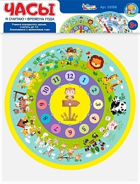 Учитесь определять время и знакомьтесь с временами года с увлекательными развивающими часиками! Часы представляют собой двухсторонний циферблат (диаметр 28,5 см), изготовленный из картона. На часах имеются пластиковые стрелочки часовая и минутная. Поворачивайте стрелочки, устанавливайте их в разных сегментах циферблата и развивайте представления ребенка о правильном распорядке дня и сезонном досуге. Учитесь определять время, выучите месяцы зимы, весны, лета и осени и весело проведите время за обучением!