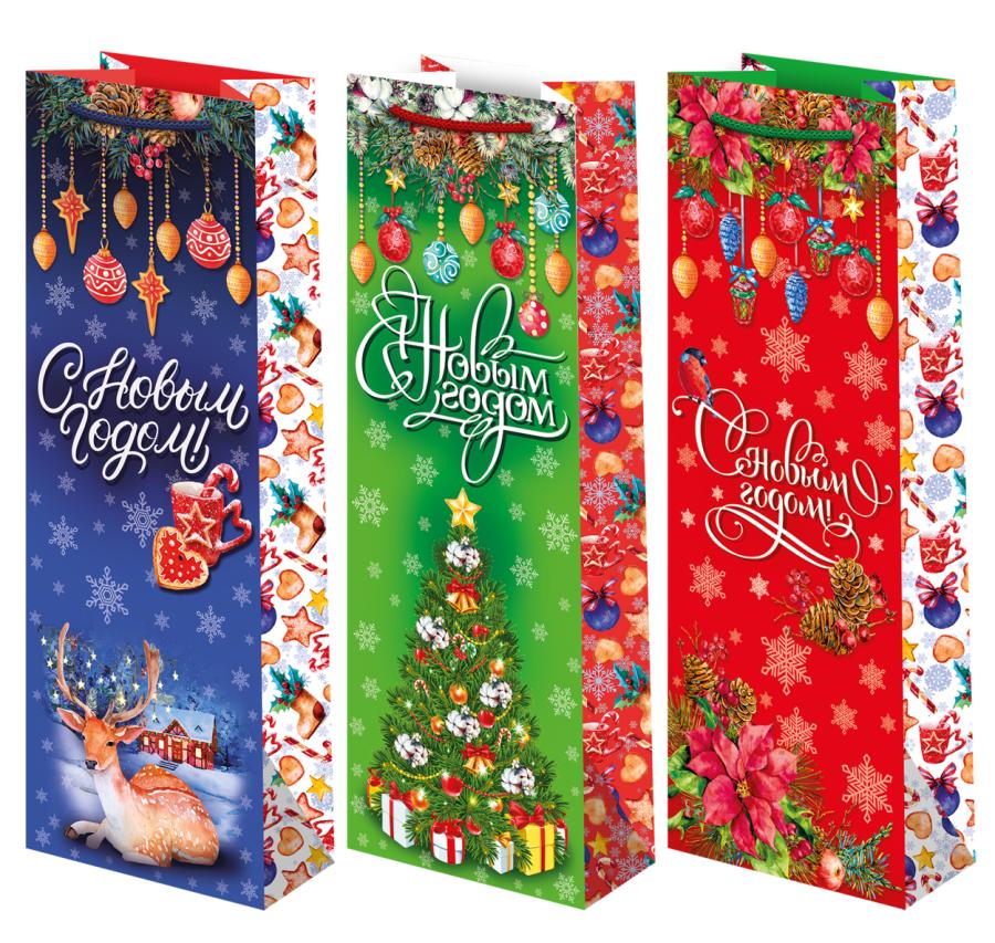 Подарочный пакет под бутылку идеально подойдет для эксклюзивной упаковки любимого напитка! Пакет с новогодним дизайном и ламинацией хорошо держит форму. Вмещает бутылки из-под вина или шампанского, а также аналогичные по размеру бутылки алкоголя.