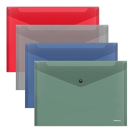 Папка-конверт на кнопке формата А4 из высококачественного полупрозрачного пластика с текстурой поверхности "зеркало", на которой не видно отпечатков пальцев и мелких царапин. Предназначена для хранения и транспортировки небольшого количества документов. Цвет папки - ассорти: синий, зеленый, красный, прозрачный. Надежная застежка-кнопка обеспечивает быстрый доступ к документам. Папка вмещает до 120 бумажных листов. Размер - 232х333мм, толщина - 0.16мм.