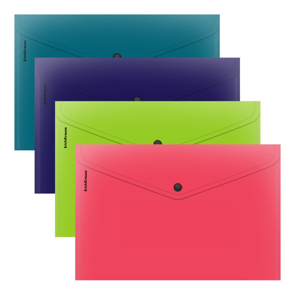 Папка-конверт на кнопке формата А4 из высококачественного непрозрачного пластика с текстурой поверхности "софт-тач", на которой не видно отпечатков пальцев и мелких царапин. Предназначена для хранения и транспортировки небольшого количества документов. Цвет папки - ассорти: бирюзовый, индиго, коралловый, лайм. Надежная застежка-кнопка обеспечивает быстрый доступ к документам. Папка вмещает до 120 бумажных листов. Размер - 232х333мм, толщина - 0.18мм. Код и баркод на каждой единице товара