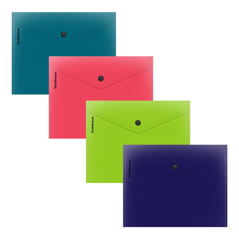 Папка-конверт на кнопке формата А5+ из высококачественного непрозрачного пластика с текстурой поверхности "софт-тач", на которой не видно отпечатков пальцев и мелких царапин. Предназначена для хранения и транспортировки небольшого количества документов. Цвет папки - ассорти: бирюзовый, индиго, коралловый, лайм. Надежная застежка-кнопка обеспечивает быстрый доступ к документам. Размер - 240x191мм, толщина - 0.18мм