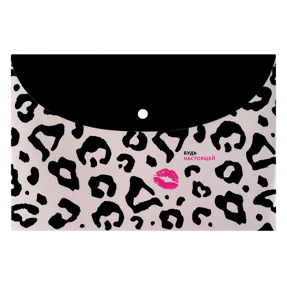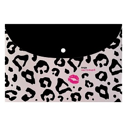 Полупрозрачная пластиковая папка на кнопке ЛЕОПАРД формата А4 для хранения, транспортировки тетрадей, канцелярских принадлежностей, разного типа документов. Папка изготовлена из гибкого и прочного полимерного материала , который не царапается и хорошо сохраняет содержимые документы от механических повреждений. (полипропилен, формат А4, 33.5х23 см, 1 отделение (-я), кнопка, УФ-печать)