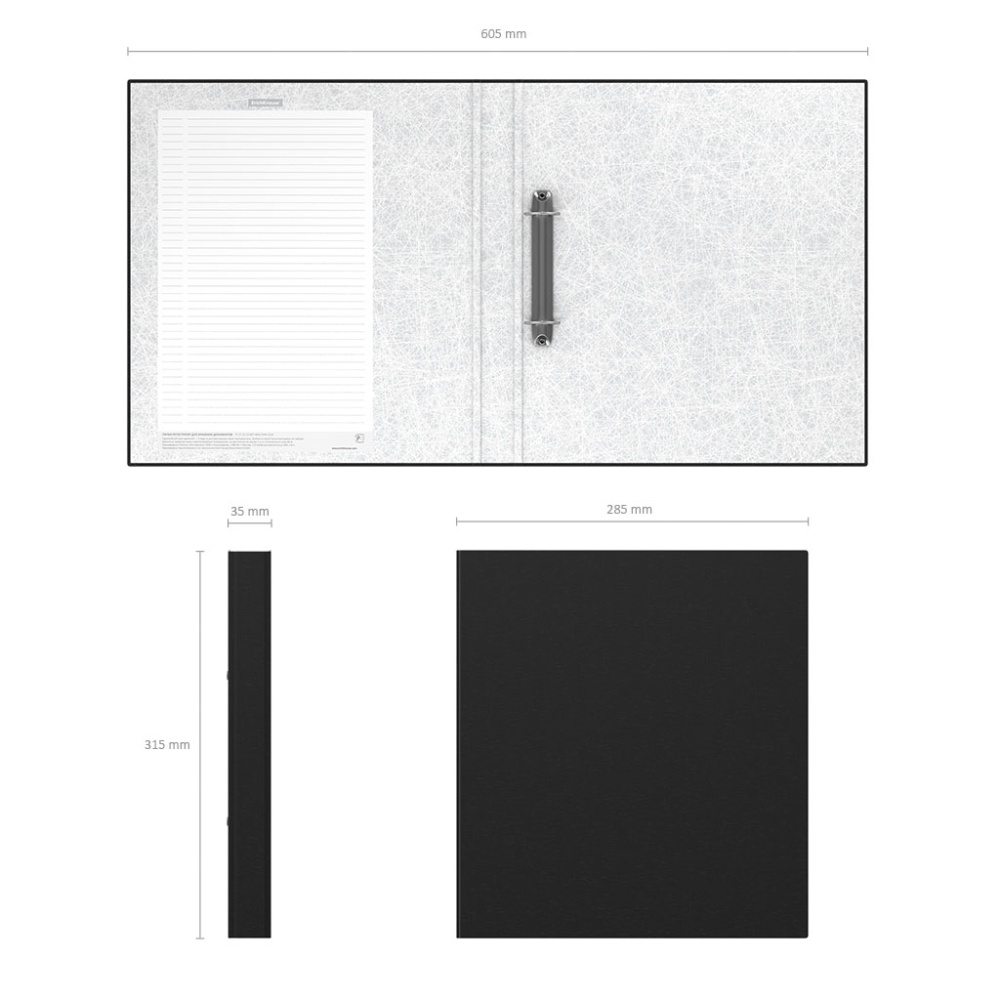 Папка - регистратор формата А4 снабжена механизмом на двух O-кольцах диаметром 25 мм. Изготовлена из плотного картона толщиной 2 мм, покрытого специальным износостойким материалом с фактурным тиснением. Корешок шириной 35 мм. Вместительность до 250 листов бумаги плотности 80 г/м?. На форзаце есть шаблон для оглавления. Удобна для проведения презентаций, представления документации на семинарах.