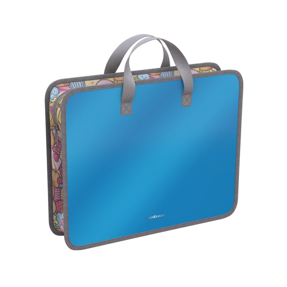 Папка для творчества формата A4+ из высококачественного ароматизированого пластика с элементами 100% полиэстера. Предназначена для переноски изделий и аксессуаров для творчества. Имеет одно большое отделение с расширением из ткани. Закрывается на молнию с мягким ходом. Для комфортной переноски ручки папки выполнены из прочной стропы. Цвет папки - голубой. Аромат - жевательная резинка. Размер - 333х268х90мм. Толщина пластика - 0.6мм. Код и баркода на каждой единице товара.