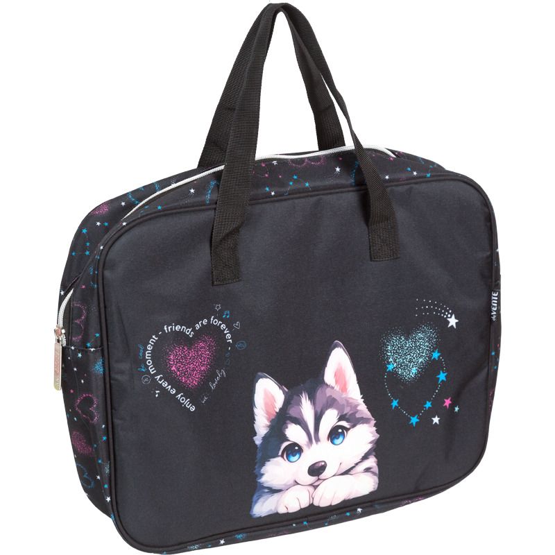 Папка для тетрадей, ИЗО и технологии "deVENTE. Cute Husky" A4 (36x28x8 см) плотный износостойкий полиэстер с водоотталкивающей пропиткой, с каучуковой аппликацией, с текстильным расширением 8 см, на молнии сверху, каучуковая аппликация, с внутренним карманом, с подкладом, с текстильными ручками увеличенной длины 28 см, окно и именная карточка для подписи