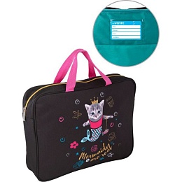Папка для тетрадей, ИЗО и технологии "deVENTE. Mermaid Cat" A4 (36x28x8 см) текстиль с печатью блестками, с текстильным расширением 8 см, на молнии сверху, с внутренним карманом, с подкладом, с текстильными ручками увеличенной длины 28 см, окно и именная карточка для подписи