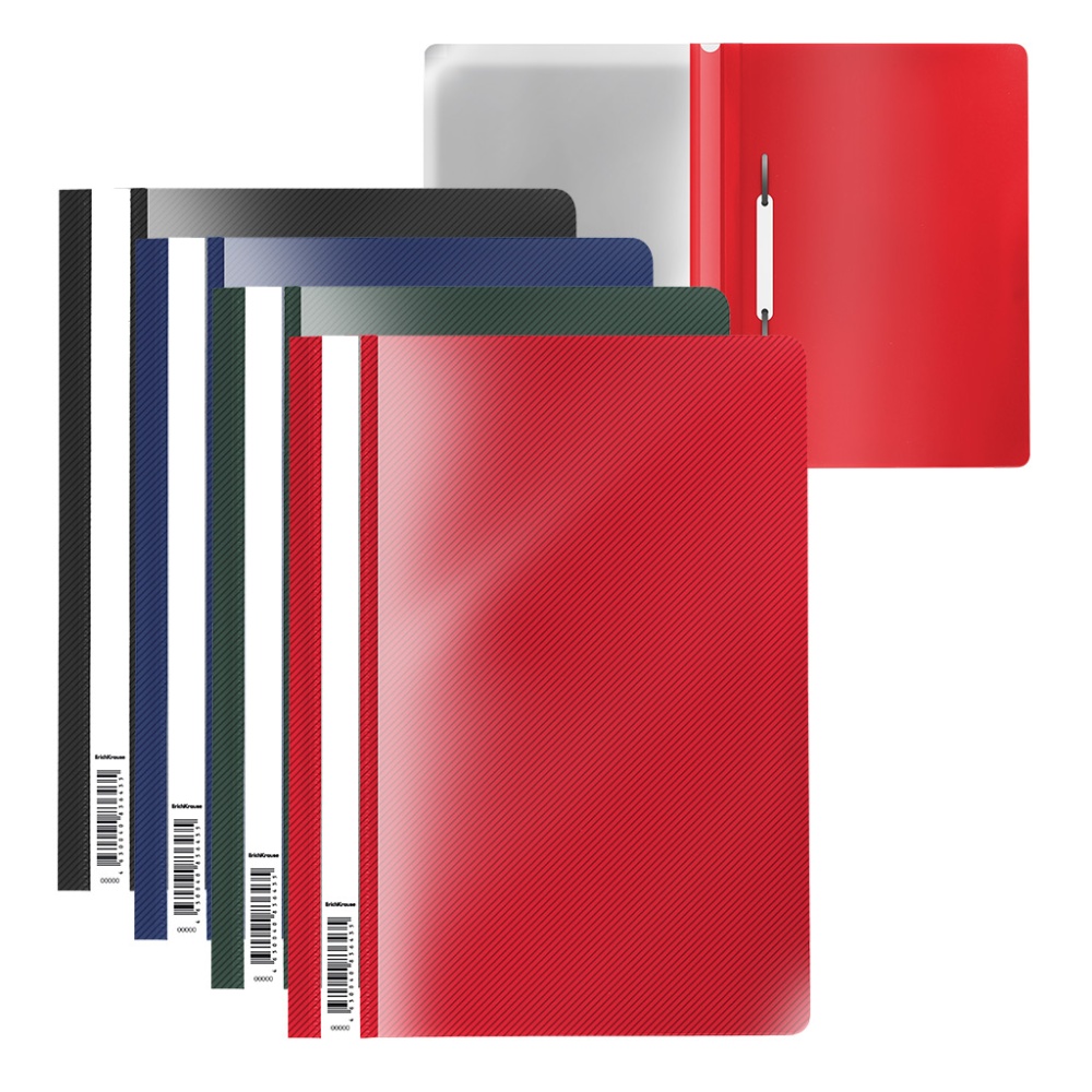 Папка-скоросшиватель пластиковая формата А4 из высококачественного пластика с текстурой поверхности "диагональ", на которой не видно отпечатков пальцев и мелких царапин. Предназначена для быстрого сшивания, хранения и просмотра документов. Цвет папки ассорти: черный, синий, зеленый, красный. Механизм - механический скоросшиватель; прозрачный верхний лист; усиленный пластиковый корешок с прозрачной полосой для информационной карточки Папка вмещает до 130 бумажных листов. Размер - 312х230 мм, толщина верхнего листа - 0.12 мм, толщина нижнего листа - 0.16 мм.