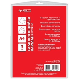 Папка карман прозр. самоклеящийся А4 223*303, 3 шт