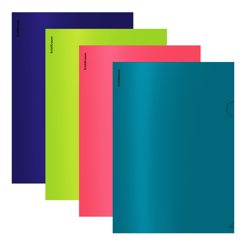 Папка-уголок формата А4 из высококачественного непрозрачного пластика с текстурой поверхности "софт-тач", на которой не видно отпечатков пальцев и мелких царапин. Предназначена для хранения и транспортировки небольшого количества документов. Папка вмещает до 20 бумажных листов. Цвет папки - ассорти: бирюзовый, индиго, коралловый, лайм. Размер - 220х310мм, толщина - 0.18мм.