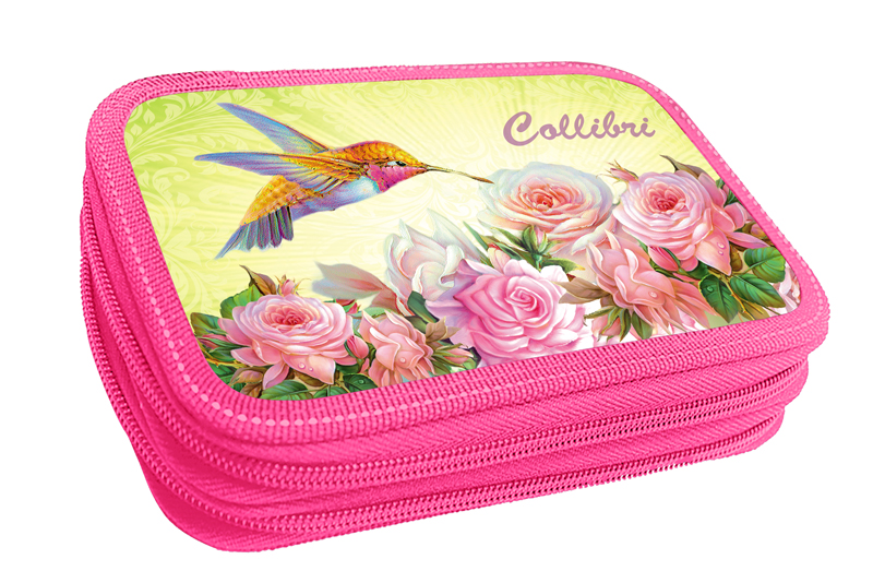 Пенал 2 отд. (205*125*40) молния, лам.картон "Колибри в розах" с блестками+ конгрев