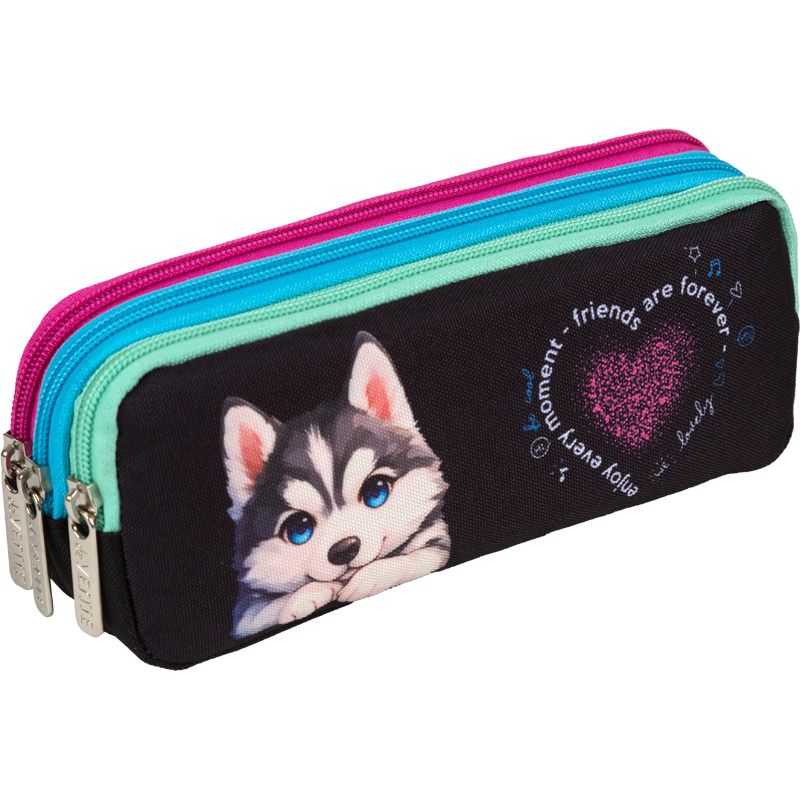 Пенал "deVENTE. Cute Husky" 21x8,5x5,5 см, прямоугольный для 60 предметов, плотный износостойкий полиэстер с водоотталкивающей пропиткой, 3 отделения на молнии, с молниями 3-х цветов