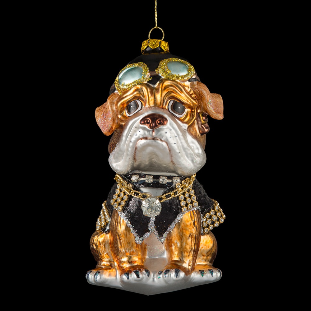 Бульдог выглядит очень реалистично. Персонаж одет в стилизованную под кожу куртку, шапку и очки пилота. Куртка декорирована черными блестками и отделкой из крупных камней. Образ завершает массивная цепь на шее. Сверкающие краски придают игрушке эксклюзивность. Украшение выполнено из стекла высокого качества. Ушки сделаны из полирезины, что позволяет максимально точно передать детализацию. Изделие является относительно тяжелым, предпочтительно использование на искусственной елке. Групповая упаковка предназначена только для безопасной транспортировки и хранения.