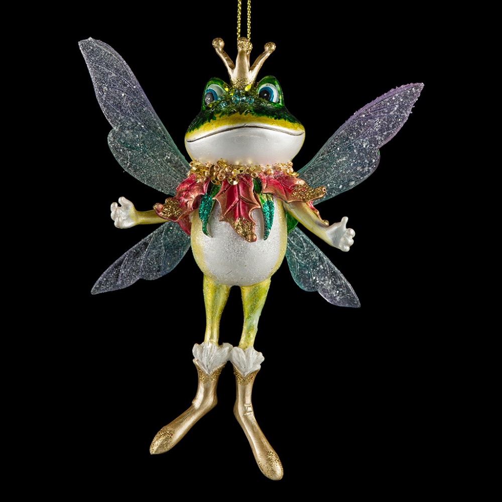 На праздничной елке могут поселиться очаровательные сказочные жители. Фея-лягушонок - оригинальное елочное украшение фантастически ярких цветов. Очаровательный персонаж имеет за спиной волшебные полупрозрачные крылышки голубого и фиолетового оттенков, сделанные из акрила. Тельце покрыто сверкающими красками, что придает украшению эксклюзивность. Шею украшает венок из листьев, декорированный пайетками и бисером. Детали персонажа и его костюма тщательно прорисованы. Изделие является относительно тяжелым, предпочтительно использование на искусственной елке. Групповая упаковка предназначена только для безопасной транспортировки и хранения.