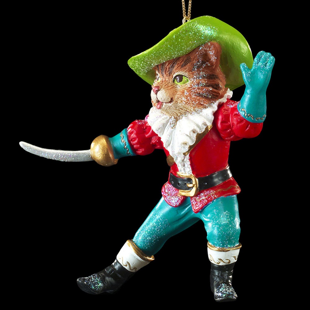 Сказочные персонажи красиво смотрятся на елке, создавая уютную атмосферу дома. Кот в Сапогах отличается тонко прорисованными деталями. Костюм выполнен в ярких цветах. Шикарная шляпа идеально подходит под цвет глаз Кота, а изящные перчатки идут в тон великолепным брюкам. В лапке персонаж держит саблю. Изделие является относительно тяжелым, предпочтительно использование на искусственной елке. Групповая упаковка предназначена только для безопасной транспортировки и хранения.