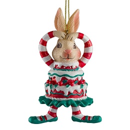 Забавный кролик одет в костюм в виде торта и поднял лапки вверх в форме сердца. Тортик декорирован пышным кремом, ягодками и выглядит очень аппетитно. Изделие является относительно тяжелым, предпочтительно использование на искусственной елке. Групповая упаковка предназначена только для безопасной транспортировки и хранения.