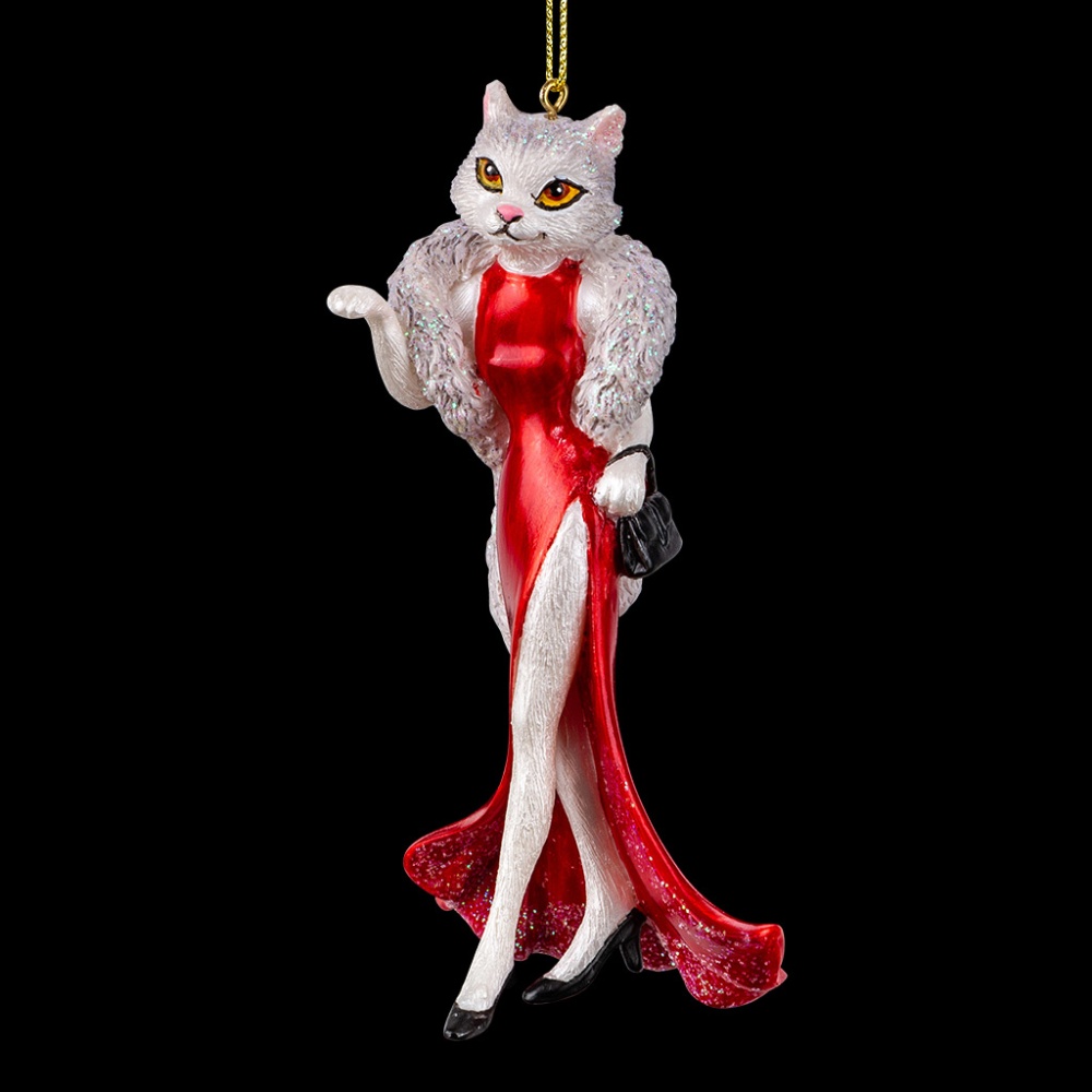 Кошка восхищает роскошным нарядом - по-голливудски эффектное красное платье поражает смелым вырезом, изящно обнажающим ногу. Серое боа гармонично сочетается с цветом шерсти самой кошечки. Необычный персонаж будет ярко выделяться среди елочных игрушек и создавать праздничную атмосферу. Групповая упаковка предназначена только для безопасной транспортировки и хранения.