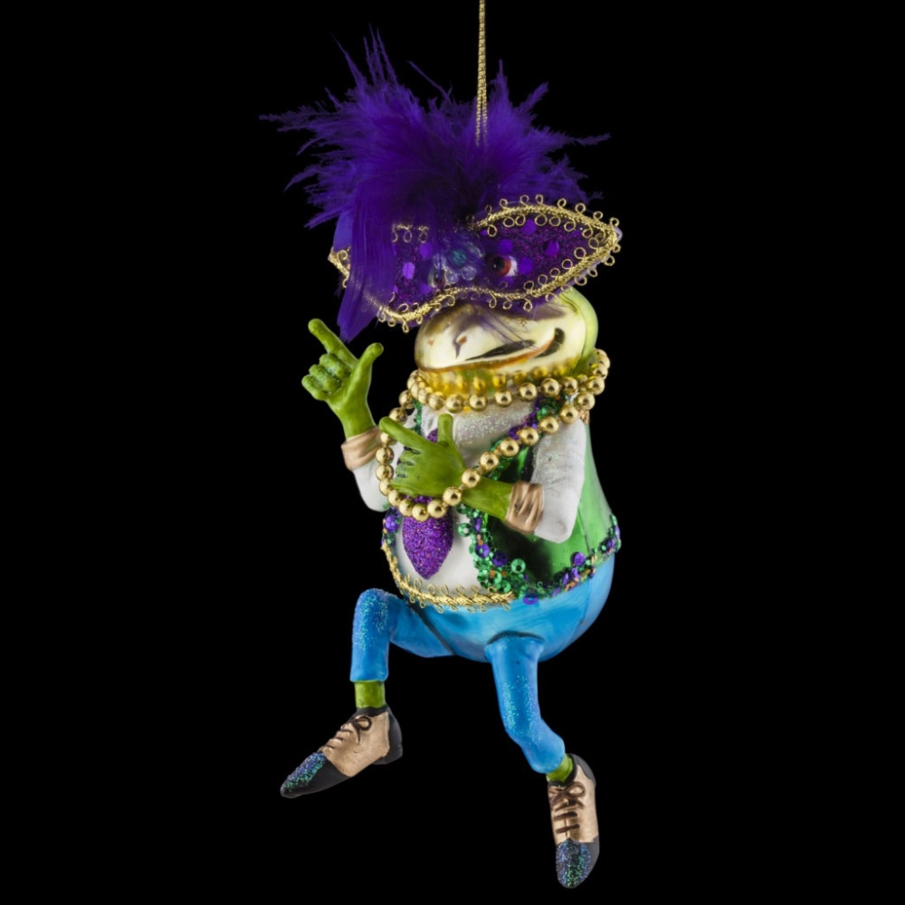 Яркие веселые персонажи Венецианского карнавала на новогодней елке вовлекут в вихрь итальянского веселья. Стильный костюм лягушки дополняют золотые бусы, обилие блесток и пайеток. Карнавальная маска сделана из текстиля и декорирована пушистыми фиолетовыми перьями. Украшение выполнено из стекла высокого качества. Руки и ноги персонажа сделаны из полирезины, что позволяет максимально точно передать детализацию. Изделие достаточно тяжелое и больше подходит для искусственных елок. Групповая упаковка предназначена только для безопасной транспортировки и хранения.