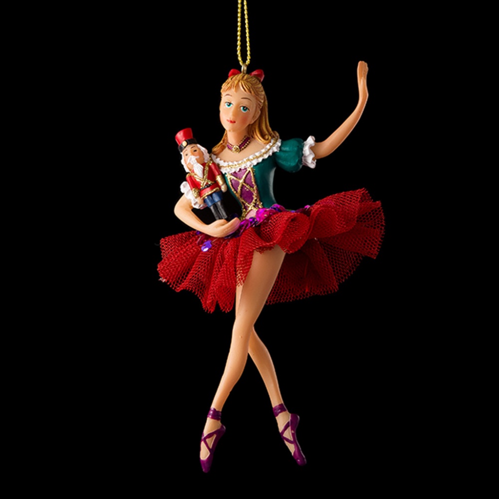 Серия елочных украшений по мотивам сказки Щелкунчик включает следующих персонажей: Мэри, Щелкунчик, Дроссельмейер, Мышиный Король и другие. Изящная балерина держит в руке крошечного Щелкунчика. Украшение отличается тонко прорисованными деталями. Наряд девушки завораживает фантастическими цветами, пышная текстильная юбка декорирована фиолетовыми пайетками в тон ожерелья балерины. Групповая упаковка предназначена только для безопасной транспортировки и хранения.