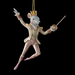 Серия елочных украшений по мотивам сказки Щелкунчик включает следующих персонажей: Мэри, Щелкунчик, Дроссельмейер, Мышиный Король и другие. Мышиный Король отличается тонко прорисованными деталями. Пастельные краски с перламутровым отливом придают украшению уникальность. Костюм и шпага подчеркнуты золотыми блестками, на голове торжественно красуется корона. Групповая упаковка предназначена только для безопасной транспортировки и хранения.