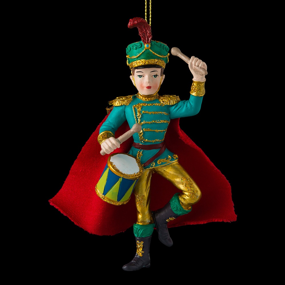 Серия елочных украшений по мотивам сказки Щелкунчик включает следующих персонажей: Мэри, Щелкунчик, Дроссельмейер, Мышиный Король и другие. Солдат-барабанщик одет в яркий костюм, плащ выполнен из красного бархата. Детали украшения отличаются искусной детализацией и подчеркнуты золотыми блестками. Групповая упаковка предназначена только для безопасной транспортировки и хранения.