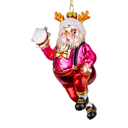 Веселые персонажи оригинально смотрятся на елке. Обаятельный Санта Клаус весело танцует, создавая ритм при помощи бубна. Особое внимание уделено костюму персонажа - красные брюки на подтяжках гармонично сочетаются с рубашкой цвета фуксия. Образ дополняют яркие акценты - праздничная шапка с оленьими рожками и галстук-бабочка. Изделие является относительно тяжелым, предпочтительно использование на искусственной елке. Групповая упаковка предназначена только для безопасной транспортировки и хранения.