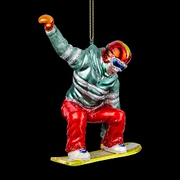 Крупный сноубордист выглядит очень реалистично. Необычная елочная игрушка станет отличным подарком для любителей зимних видов спорта. Украшение выполнено из стекла высокого качества. Руки и ноги со сноубордом сделаны из полирезины, что позволяет максимально точно передать их форму. Изделие является относительно тяжелым, предпочтительно использование на искусственной елке. Групповая упаковка предназначена только для безопасной транспортировки и хранения.