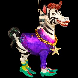 Яркие веселые персонажи Венецианского карнавала на новогодней елке вовлекут в вихрь итальянского веселья. Красочное украшение в виде зебры имеет массу ярких деталей: ирокез, цепь со звездой, фиолетовый пиджак, стильные бирюзовые ботинки и потрясающую улыбочку. Изделие выполнено из стекла высокого качества. Мордочка и копыта персонажа сделаны из полирезины, что позволяет максимально точно передать детализацию. Групповая упаковка предназначена только для безопасной транспортировки и хранения.