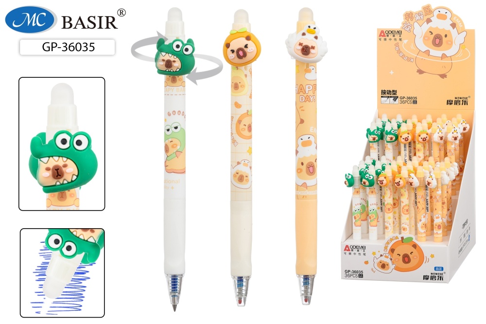 Ручка гелевая, автоматич. Стираемая. "КАПИБАРА". Цв.корпус ассорти. 0,5 mm. Синяя