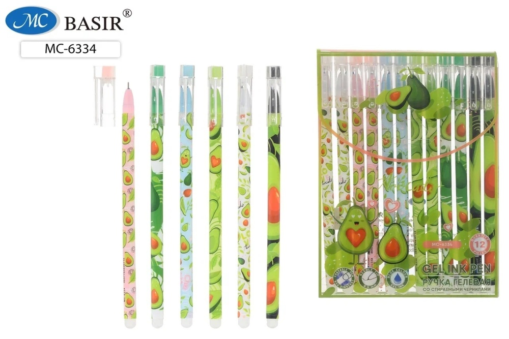 Ручка гелевая, стираемая. "Авокадо". Корпус яркий,цветн.с рисунком, ассорти. 0,5 мм. Синяя