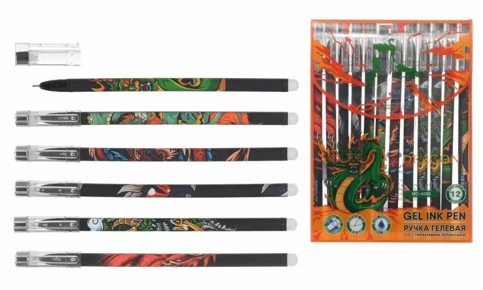 Ручка гелевая стираемая "ДРАКОН". Чёрный корпус с рисунком в ассорт. 0,5 мм. Синяя