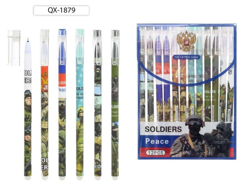 Ручка гелевая. Стираемая. ""SOLDIERS PEACE". Цв.корпус с рисунком. Ассорти. 0,5 mm. Синяя
