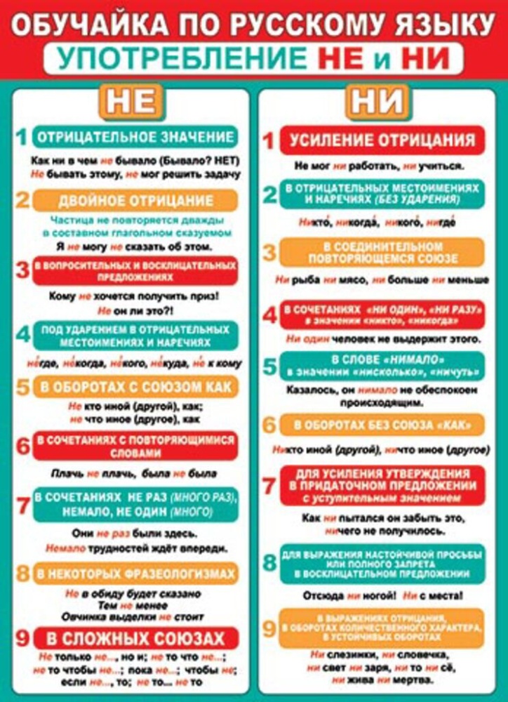 Плакат 50*70см "Обучайка по русскому языку. Употребление НЕ и НИ"