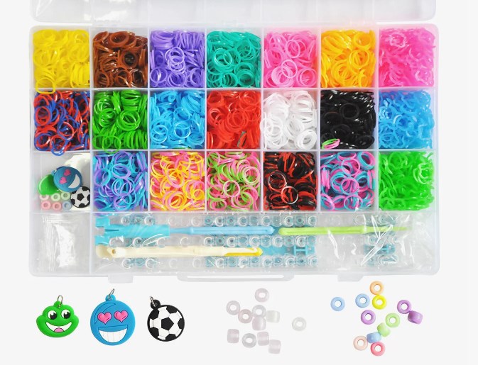 Плетение из резинок. Набор: Резинки разноцветные 2000 шт, 20 цв. + инструменты для плетения, бусины, подвески. В пластиковой коробке