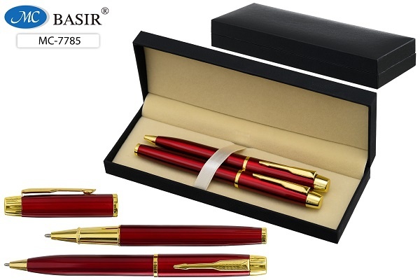 Подарочный набор: 2 металлические ручки ( с поворотным механизмом и ручка с колпачком), объёмный красный корпус с элементами золота; цвет чернил-синий; подарочный футляр.