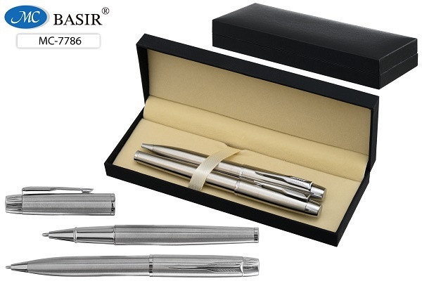 Подарочный набор: 2 металлические ручки ( с поворотным механизмом и ручка с колпачком), объёмный серебристый корпус; цвет чернил-синий; подарочный футляр.