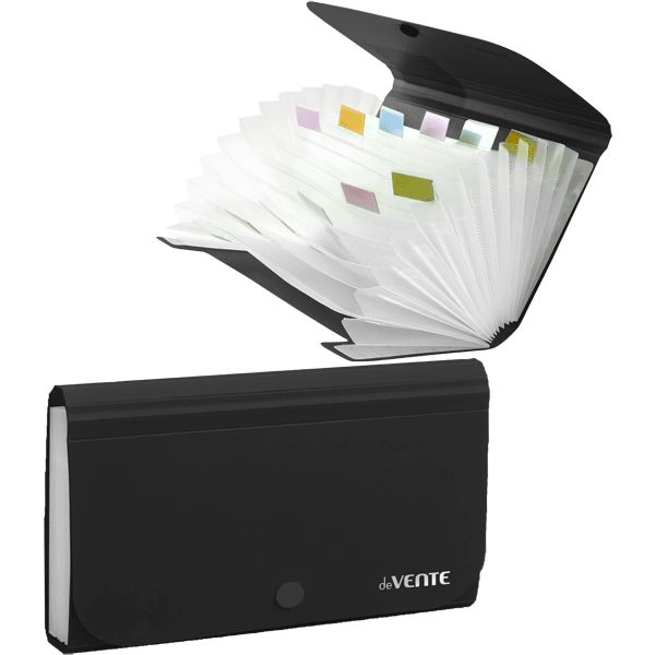 Папка на кнопке с 13-ю отделениями "deVENTE. Black" пластиковая 700 мкм, для документов формата C6 (17,8x12x2 см) внутренние отделения толщиной 170 мкм, в комплекте с бумажными цветными индексами, черная