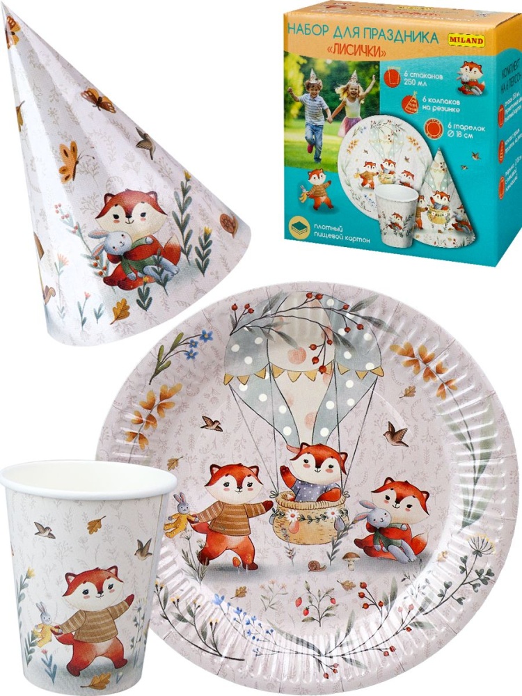 Набор для праздника "Лисички" тарелка 6 шт, стаканы 6 шт, колпаки 6 шт