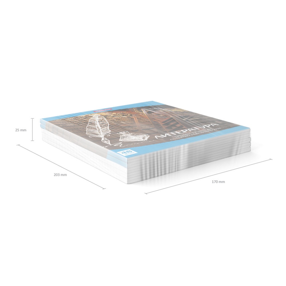 Тетрадь предметная формата А5+ (170х203 мм). Обложка из высококачественного мелованного картона плотностью 190 г/м2. В блоке 48 листов в линейку с полями. Бумага офсетная плотностью 60 г/м2. Белизна бумаги - 100%. Цвет линовки - синий. Скругленные уголки обложки и блока. Тип скрепления - скоба. Имеет инфо-блок с кратким изложением школьной программы. Тетради упакованы в термоусадочную плёнку по 5 штук.
