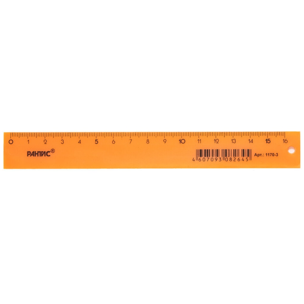 Линейка 16 см с ровной чёткой миллиметровой шкалой. Цветная непрозрачная узкая. Изготовлена из пластика. Штрихкод на единице изделия.