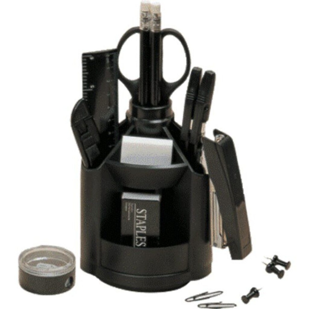 Органайзер настольный "Attomex" 10 предметов, черный, вращающийся, в картонной коробке. Ножницы, линейка 15 см, шариковая ручка, нож канцелярский 9 мм, степлер 10, скобы 10 500 шт, 2 карандаша чернографитных HB, точилка, скрепки