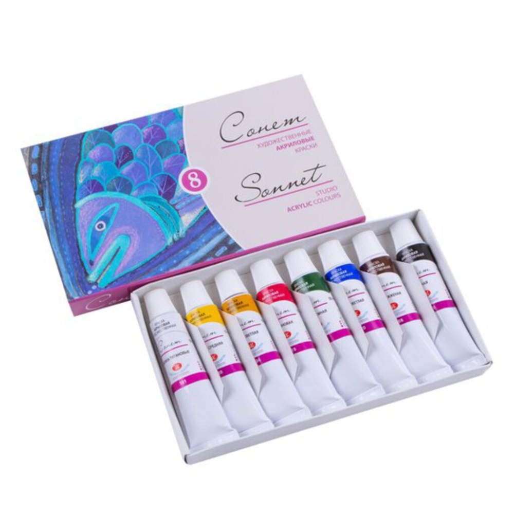 Художественные акриловые краски Сонет - качественный и доступный по цене материал для начинающих художников. Акрил Сонет предназначен для живописи и декоративно-прикладного творчества. Краски выпускаются по современным рецептурам. Отличаются яркостью и чистотой цвета, легко смешиваются с водой. Наносятся на бумагу, картон, грунтованный холст, дерево, металл, кожа, ткань. При высыхании образует эластичную несмываемую матовую пленку. Палитра в наборе акриловых красок Сонет состоит из 8 базовых цветов, необходимых начинающему художнику для выполнения учебных работ, этюдов и эскизов.